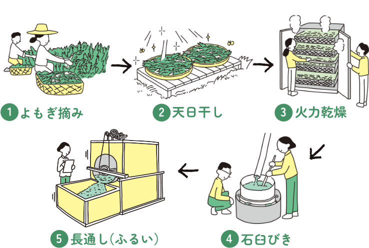5月~7月ごろよもぎを刈り取り乾燥させ、臼で砕き葉や茎を取り除く作業を何度も繰り返します。すると、ふんわりとした綿毛だけが残ります。これが、お灸に使われる「もぐさ」です。