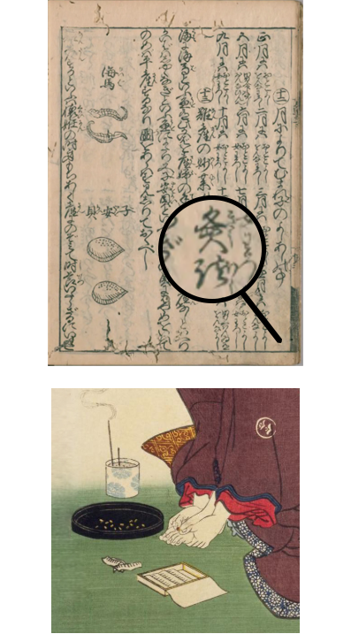 作品の女性も「切りもぐさ」を用いて、慣れた様子で着物を前後逆に着て背中を丸めてお灸をする姿からも、日頃からお灸に親しんでいた様子が感じられます。