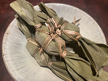 よもぎを練り込んだ餅に餡を包み、香り豊かな笹の葉でくるみ、スゲなどのひもで結んだ俵形が特徴です。