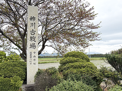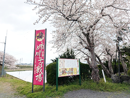 姉川の野村橋付近一帯は、姉川の戦いの舞台となった場所です。1570年6月28日、川をはさんで向かい合った織田信長・徳川家康の連合軍と、浅井長政・朝倉義景の連合軍が対峙しました。
