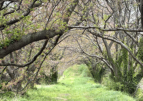 今は桜や青麦畑が広がり、歴史をたどりながら季節も楽しめる散策コースです。