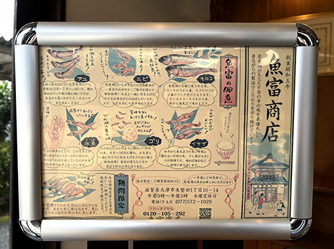 浮御堂の門前に店を構える魚富商店は、昭和5年創業の老舗湖魚佃煮専門店です。