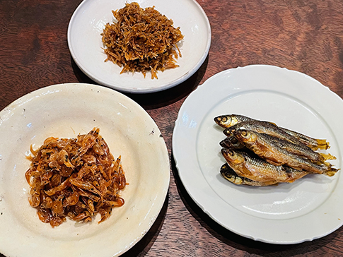 人気の佃煮盛り合わせをはじめ、冬の湖国を代表する名産 鮒寿司、香ばしいエビ豆、琵琶湖の王様といわれるモロコ、アユの稚魚である氷魚(ひうお)、ゴリなど、季節ごとに並ぶ湖魚の品々も魅力です。どれも素材の旨みがしっかり感じられ、素朴で深い味わいが楽しめます。